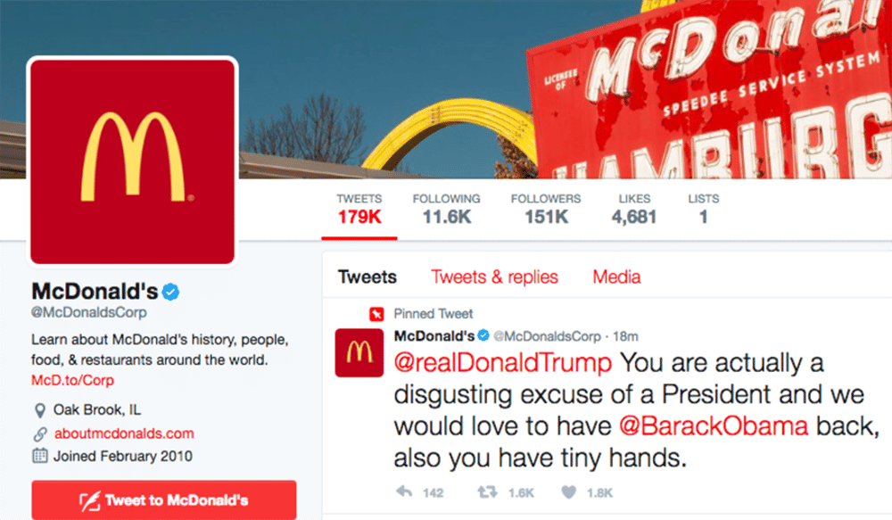 "Sebenarnya kamu (red- Trump) sangat menjijikkan, kami sangat ingin Barack Obama kembali menjadi Presiden, ukuran 'tanganmu kecil' (red- ukuran penis) pula!" Begitulah kicauan lengkapnya Bela, dan ternyata akun McDonald saat itu diretas oleh orang yang tak bertanggung jawab! McDonald pun langsung memverifikasi kalau kicauan tersebut sudah dihapus dan menyerahkan kepada pihak berwenang untuk diinvestigasi.