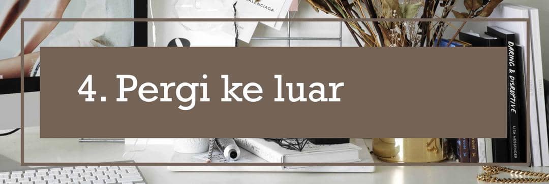 Jangan biarkan dirimu terlalu lama dalam suatu ruangan, hal ini juga dapat memicu timbulnya stress yang punya dampak terhadap lingkungan sekitar. Nggak ada salahnya keluar ruangan kerja atau rumah agar pikiran dan badan kembali segar. Jika ada long weekend nggak ada salahnya untuk menjelajah tempat baru. Berjalan dan menemukan suatu yang menarik di lingkungan sekitar juga bisa menjadi alternatif. Jangan biarkan waktu luangmu digunakan untuk mengerjakan pekerjaan kantor.