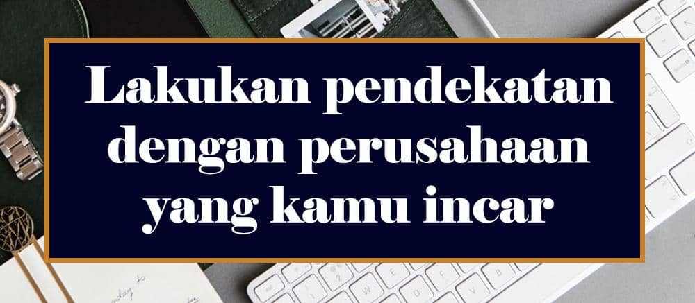 Berusahalah untuk mendekati perusahaan yang kamu incar. Bukan hanya dengan meletakkan lamaran, tetapi juga mengajak mereka mengobrol. Misalnya tentang profil perusahaan dan perkembangannya saat ini serta visi mereka. Tanyakan juga proses perekrutan pada tim HRD, selain untuk mengetahuinya, juga untuk menunjukkan antusiasme. Ceritakan mereka tentang latar belakang pendidikan, pengalaman, atau prestasi yang kamu miliki yang berkaitan dengan kriteria yang mereka butuhkan.
