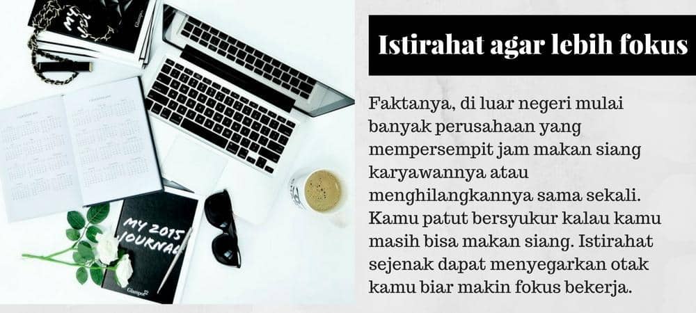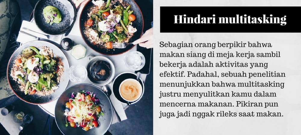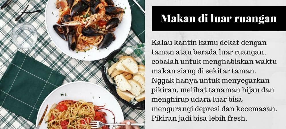 Jam makan siang merupakan jam yang paling ditunggu-tunggu oleh sebagian besar pekerja kantoran. Di samping mengisi perut, jam makan siang juga dianggap sebagai refreshing sementara dalam bekerja. Tapi, pekerjaan yang menumpuk dan meeting di sana-sini bisa buat kamu melewatkan makan siang. Padahal, manfaatnya banyak lho. Begini caranya memaksimalkan jam makan siang kamu.
