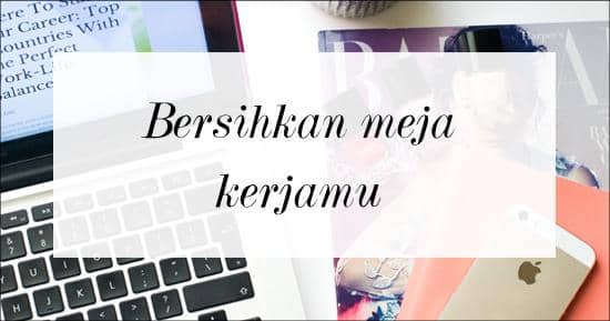 Walaupun kelihatannya sederhana, membersihkan meja kerjamu bisa menjadi salah satu langkah yang sangat terasa. Buanglah kertas-kertas yang sudah tak kamu pakai, rapikan dokumen-dokumenmu, dan hiasi mejamu dengan aksesoris yang cantik seperti tanaman dan bingkai foto.