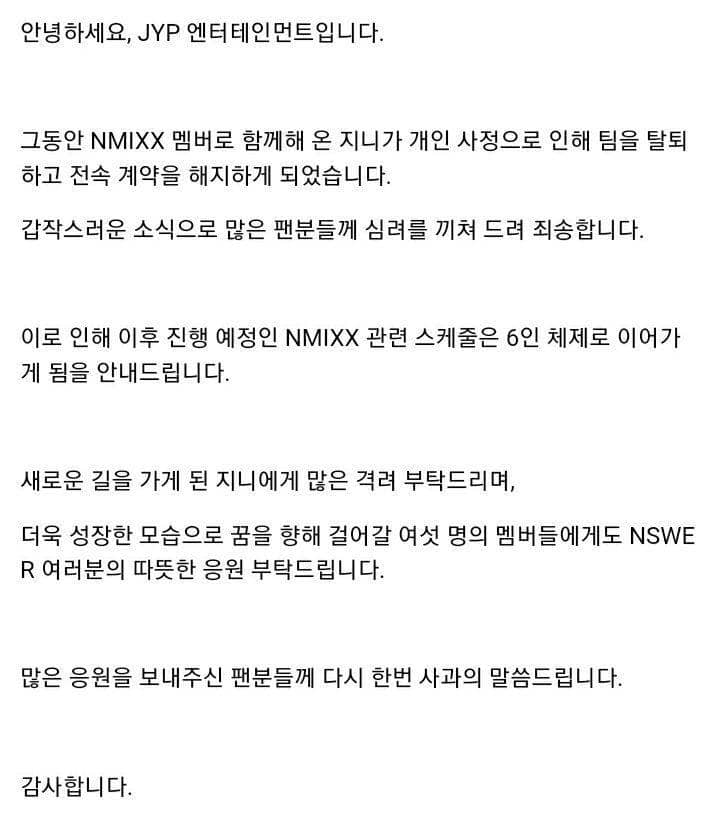 Melalui pernyataan resmi tersebut, pihak agensi juga meminta maaf karena kabar yang disampaikan dan menimbulkan masalah bagi para penggemar NMIXX. Hingga saat ini belum diketahui masalah pribadi seperti apa yang mengharuskan Jinni sampai harus hengkang bahkan dari agensinya.