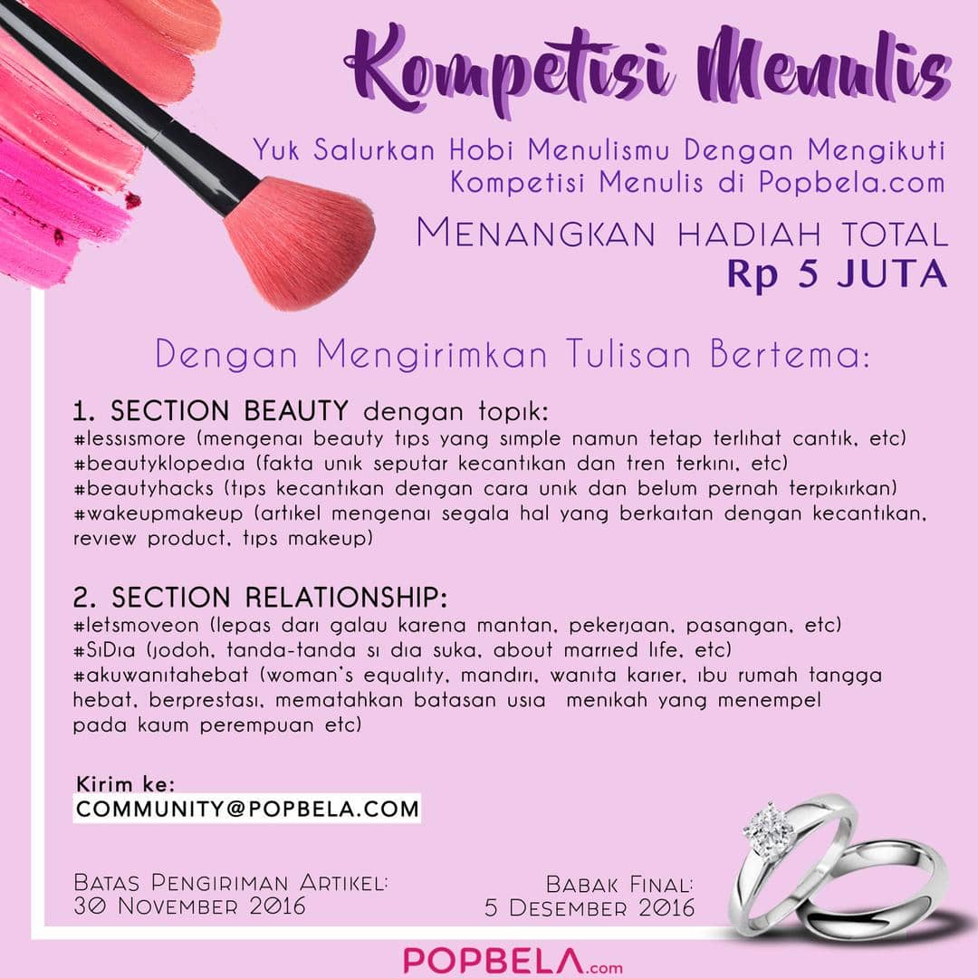 Bela, kamu sudah tahu kan kalau Popbela.com sudah membuka kompetisi menulis sejak 25 Oktober 2016 dan berakhir di akhir November, tepatnya 30 November 2016? Bagaimana, kamu sudah menentukan tema dan mengirimkan tulisanmu ke community@popbela.com?
