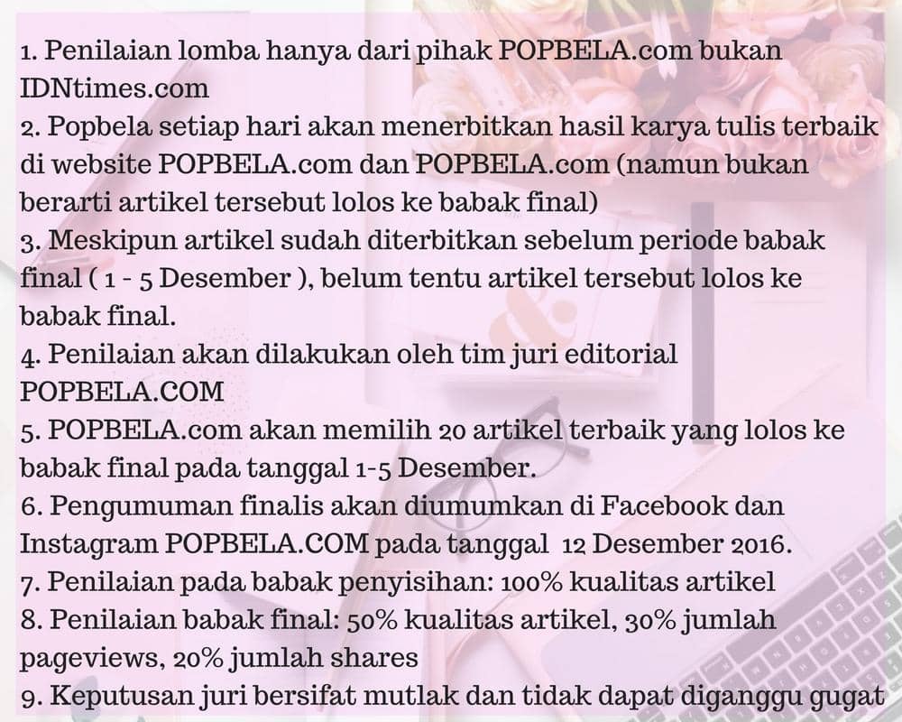 Dan kamu juga wajib tahu bagaimana sistem penilaian kompetisi menulis #POPBELAcommunity. Kalau perlu dicatat ya Bela..