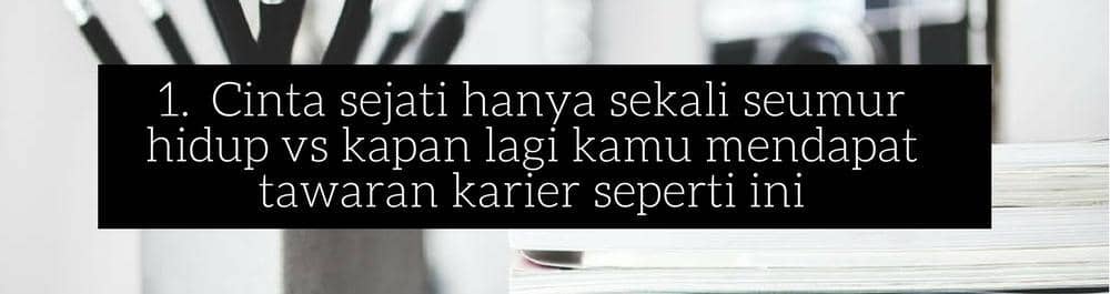 Menemukan pasangan yang benar-benar klop dan membuatmu merasa jadi cewek paling bahagia sedunia mungkin hanya akan terjadi sekali seumur hidupmu. Buat apa kamu memiliki pekerjaan paling keren sedunia kalau kamu selalu merasa kesepian tanpa pasanganmu? Di sisi lain, sebelum kamu berpacaran dengan pasanganmu tentu kamu pernah menjalani hidup tanpanya dan hidupmu baik-baik saja, kan? Apalagi tawaran karier yang bagus biasanya tak datang dua kali. Kalau suatu hari kamu menyesal karena nggak mengambil tawaran itu, pasanganmu yang akan kena imbasnya.