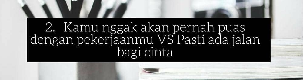 Pada dasarnya kamu menginginkan pekerjaan itu karena ambisimu. Setelah mendapatkan pekerjaan impianmu itu, kamu pasti menginginkan pekerjaan yang lebih baik lagi. Intinya, kamu nggak akan pernah puas dengan pekerjaanmu saat ini. Jadi mengapa kamu harus mengorbankan pasangan yang membuatmu bahagia demi mengejar karier yang tak akan pernah membuatmu merasa puas? Tapi kalau kamu dan pasangan benar-benar mencintai satu sama lain, sesulit apa pun keadannya kalian pasti bisa mencari jalan keluar. Kariermu mungkin akan membuat hubungan kalian jadi sulit, tapi bukan berarti mustahil. Kadang kesulitan-kesulitan seperti ini yang justru menguatkan hubunganmu dengan pasangan.