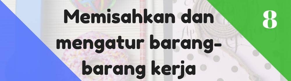 Jangan sampai perkakas atau perlengkapan untuk kerja campur-aduk dengan perlengkapan di rumah. Kalau sewaktu-waktu kamu butuh mendesak dan barang itu hilang, kamu sendiri yang kerepotan. Makanya kamu harus punya ruang kerja khusus, sehingga perlengkapan bekerjamu bisa ditaruh semua di ruangan tersebut.