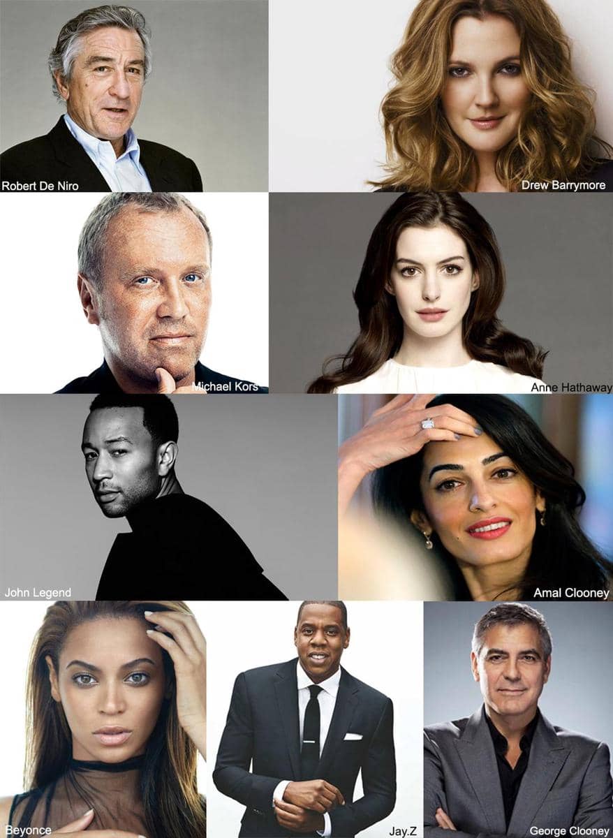 Jay.Z dan Beyonce secara tegas memilih Clinton, Jay.Z pun sempat mengatakan Trump tidak pantas menjadi Presiden untuk Amerika. George dan Amal Clooney tidak memilih Trump karena menurut mereka Trump seorang xenophobic atau ketakutan irasional terhadap orang asing. Robert De Niro secara teruka mengajak para undangan Hollywood Film Awards untuk memilih Hillary Clinton, ia pun sama sekali tak menginginkan Trump menjadi Presiden. Bagi Drew Barrymore, Hillary Clinton akan jadi Presiden perempuan yang keren! Kamu tahu kalau Anna Wintour menjadi style consultan untuk Hillary Clinton? John Legend juga mendukung Hillary Clinton dan bernyanyi di saat ulang tahun Clinton yang ke 68 tahun. Di Instagramnya, Anne Hathaway menulis caption "I like the idea of Hillary making those calls #hillary #supremecourt #weholdthesetruthstobeselfevident”. Seorang designer ternama, Michael Kors pun memilih Hillary Clinton dan dengan lantang mengatakan "Aku memilihnya!".