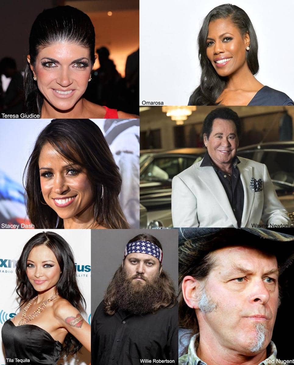 Willie Robertson, CEO reality show Duck Dynasty star dan Duck Commander ini mendukung Trump karena sama-sama menciptakan TV shows. Penyanyi legendaris asal Amerika, Wayne Newton ini memang sudah lama bersahabat dengan Trump dan menemani Trump saat debat kepresidenan di Universitas Nevada Las Vegas Oktober lalu. Tila Tequila, bintang reality show ini gencar mendukung misi Trump untuk membangun batasan antara Amerika dan Meksiko. Teresa Giudice, penulis buku masakan terlaris ini secara tegas menilai Trump akan bekerja sangat baik. Saat konser, Ted Nugent, musisi Amerika yang juga berkarier di bidang politik ini justru secara terang-terangan mengatakan ia memilih Trump. Stacey Dash, aktris yang berperan dalam drama seri 'Clueless' ini percaya kepada Trump karena menurutnya misi Trump menjaga negara Amerika sangatlah bisa diandalkan. Omarosa, memilih Trump karena ia menghormati sosok Trump yang konsisten dan Trump benar-benar tahu apa yang sedang dia lakukan.