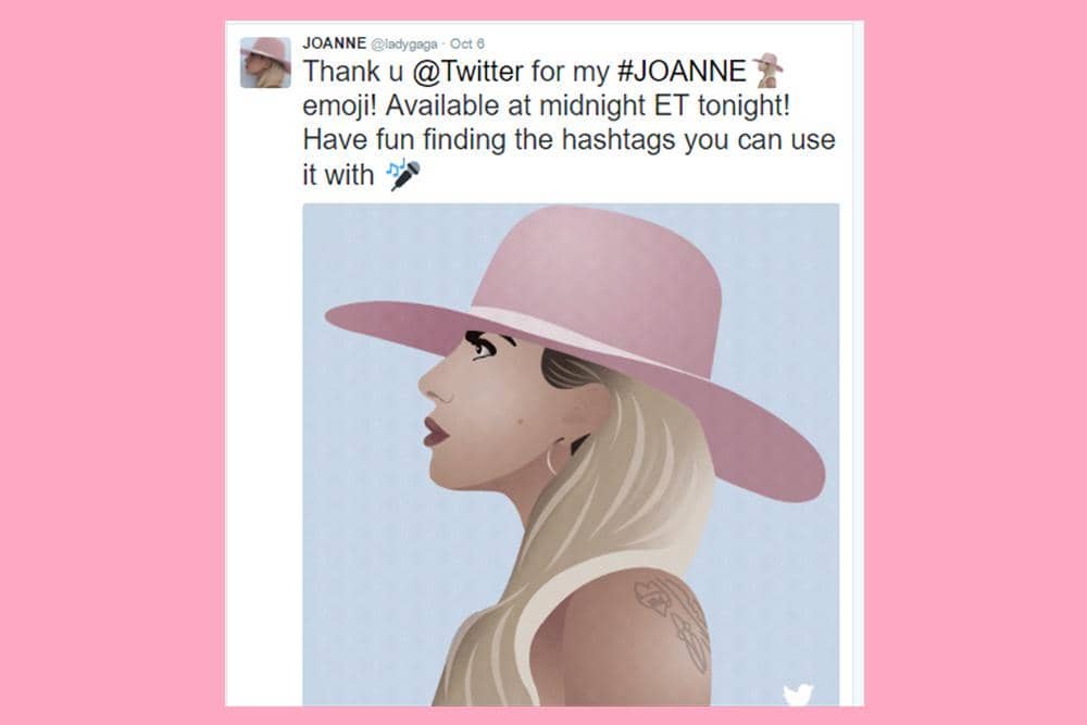 Yeay, good news buat para Twitter addict yang juga mengidolakan band legendaris Rolling Stones dan pop diva Lady Gaga! Pasalnya, jika kita menggunakan hashtag #BlueAndLonesome, di timeline Twitter-mu akan muncul emoji logo Rolling Stones, bedanya icon ciri khas Rolling Stones ini tampilannya berwarna biru, bukan warna merah seperti biasanya. Sedangkan emoji Gaga yang tengah menggunakan topi berwarna pink akan muncul di timeline mu jika kamu mengetik nama album Gaga terbaru, #JOANNE! Emoji ini persis banget dengan tampilan cover album terbaru Lady Gaga. Gaga pun sangat diuntungkan lho dengan hashtag JOANNE ini, terhitung sejak tanggal 5 Oktober kemarin, sebanyak 64 juta akun telah menggunakan tagar #JOANNE.