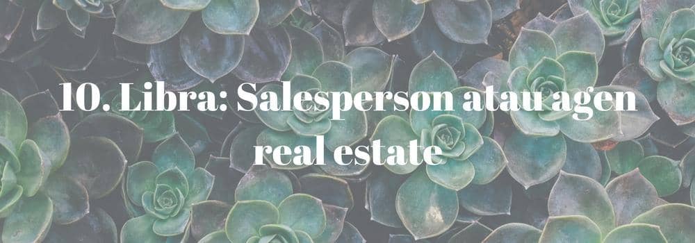 Kamu yang berzodiak Libra sangat memesona. Kamu tahu cara mendapatkan yang diinginkan dari orang lain, dengan tata krama yang ramah. Kamu berjuang untuk membuat orang-orang di sekitarmu bahagia, dan membuat mereka merasa menjadi bagian dari suatu hal. Tapi terkadang, Libra bersikap terlalu bimbang. Kamu berbakat secara alami dalam negosiasi sehingga cocok untuk bekerja sebagai salesperson atau agen real estate.