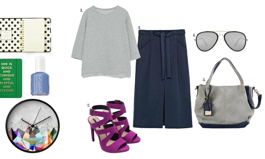 Current mood: gloomy. Di hari Kamis ini, rasanya malas banget untuk beraktivitas. Untuk menyesuaikan suasana hatimu, warna abu-abu adalah jawabannya! Kamu bisa memakai sweatshirt dan rok midi supaya tetap nyaman melakukan berbagai kegiatan hari ini. Tas satchel juga bisa membantumu untuk membawa barang-barang yang sering tercecer di mana-mana. Agar semangatmu meningkat di gloomy Thursday ini, tambahkan semburat warna dengan sepasang sandal heels berwarna ungu terang.