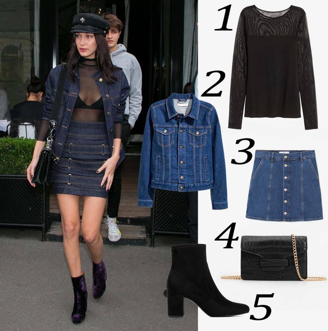 Siapa bilang pakai denim nggak bisa terlihat seksi?! Lihat gaya Bella Hadid yang satu ini. Tampil menggoda dengan atasan tembus pandang dan kombinasi jaket dan rok denim, membuatnya terlihat begitu edgy. Sementara sepatu boots memberikan efek keren secara instan.