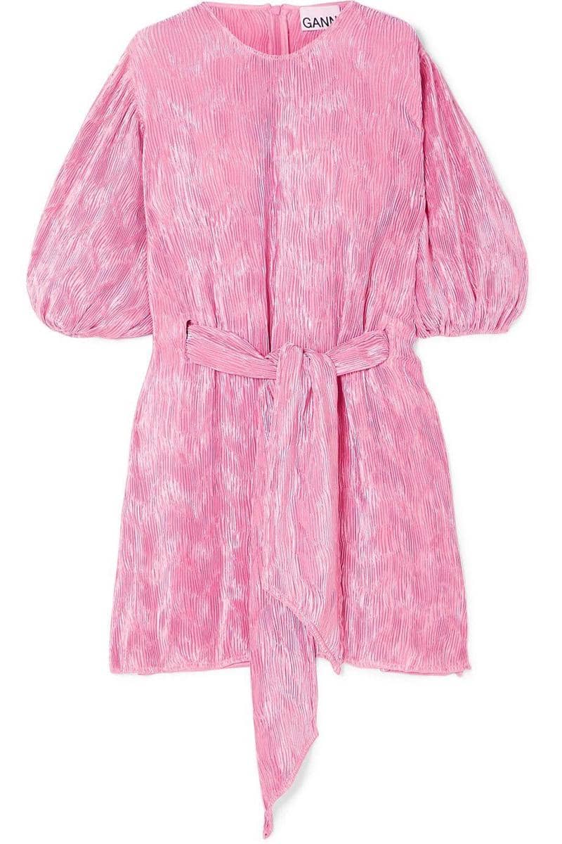 Belted plissé-satin mini dress, GANNI, $225.00