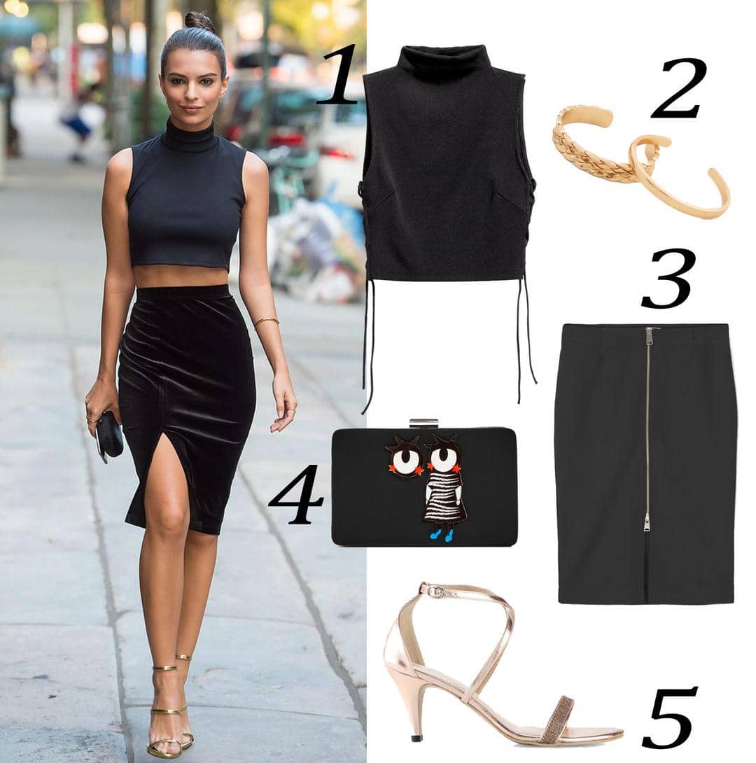 Seksi tapi sangat berkelas! Ini kata yang tepat untuk menggambarkan gaya Emily Ratajkowski kali ini. Terlihat simple, ia mengkombinasikan atasan cropped dengan rok pensil yang sedikit meng-ekspos bagian pahanya. Untuk menyempurnakan look-nya, ia memilih gelang dan sandal heels berwarna emas yang mencuri perhatian.