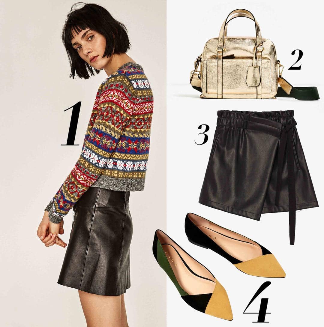Happy Sunday, Bela! Yuk tampil super chic dengan mix and match leather skort dengan colorful patterned sweater di hari Minggu. Mengingat dan memeluk suasana natal yang akan datang, sweater ini akan membuat kamu merasa lebih "festive"! Mix and match outfit dengan perpaduan tri-tone pointed flats akan membuat total look kamu terlihat lebih manis dan chic. Jangan lupa untuk menjinjing gold mini satchel bag. Happy Sunday, Bela!