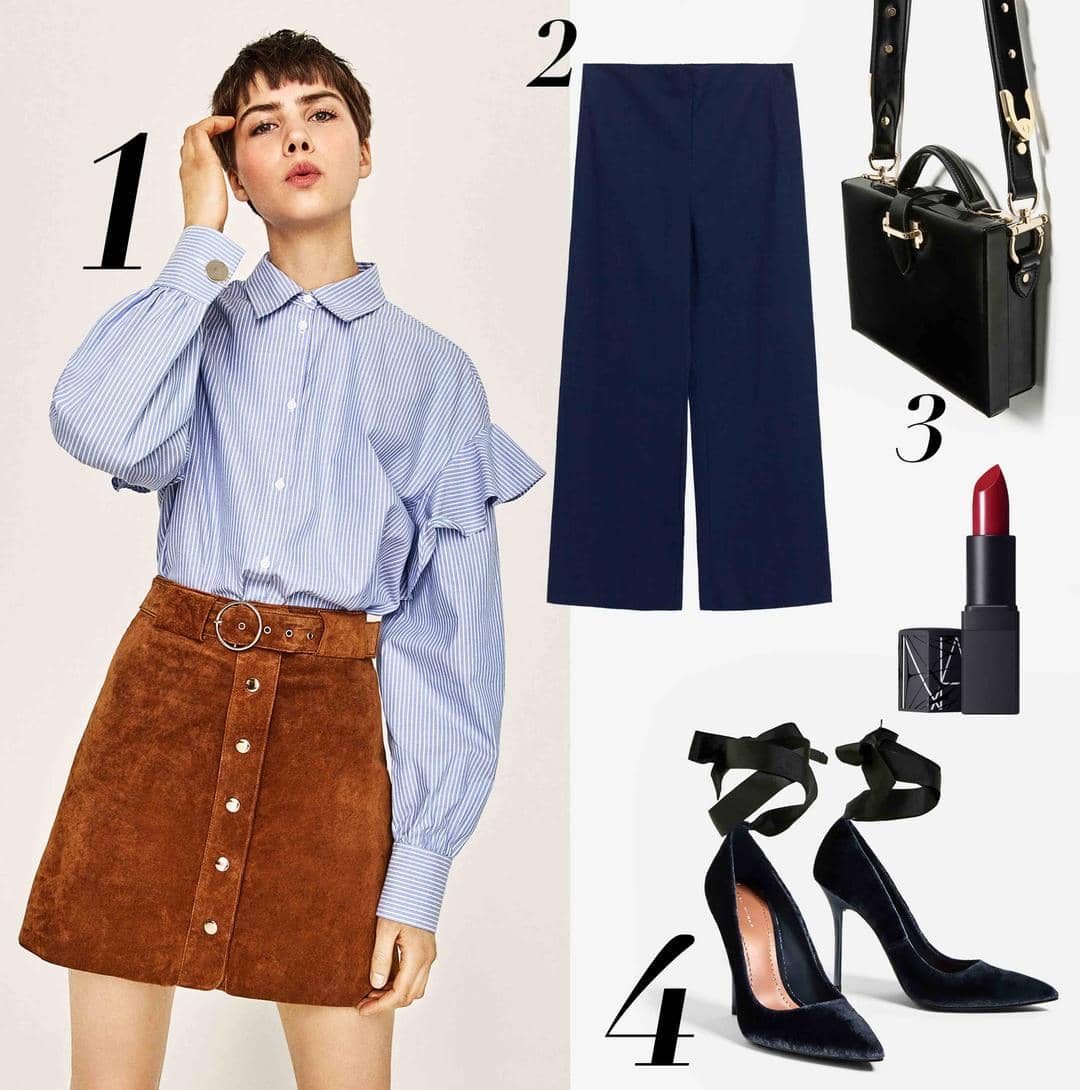 Happy Tuesday, Bela! Untuk kamu yang bekerja di tempat yang lebih tradisional seperti bank dan ingin tampil stylish, kamu bisa mencoba mix and match culotte pants dan kemeja ruffles. Outfit ini membuat tampilan kamu tetap rapih, namun ditambah dengan detail pada kemeja yang membuat look kamu menjadi lebih chic dibandingkan dengan kemeja biasa. Untuk tampilan yang lebih polish, kamu bisa memakai velvet heels dengan detail lace-up. Jangan lupa untuk melengkapi total look dengan satchel box bag. Happy Tuesday, Bela!