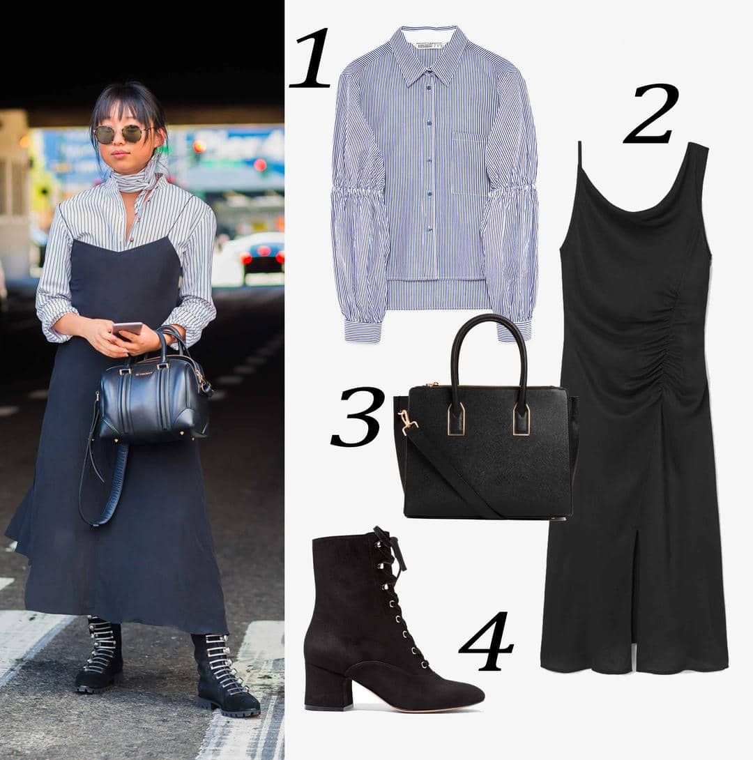 Gaya yang satu ini pasti udah enggak asing lagi kan? Dimana kita sering melihat cewek-cewek ibu kota favorit memadukan dress dengan kemeja maskulin seperti ini. Nah jika biasanya gaya ini dikombinasikan dengan sneakers yang nyaman, coba yuk twist sedikit dengan boots bergaya militer untuk kesan yang tangguh. Worth to try!