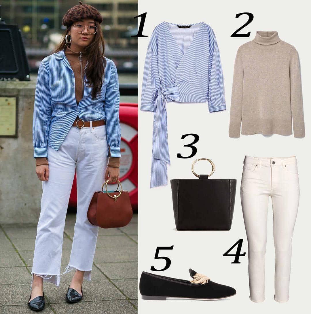 Buat kamu yang bisa tampil kasual ke kantor, tips mix n match ini boleh kamu coba lho! Dimana goal dari look kali adalah menggabungkan sisi formal dengan sentuhan quirky yang statement. Cukup kombinasikan kemeja formal kamu dengan turtleneck, jeans putih, dan loafers! Nah kalau kamu mau totalitas bisa tambahkan topi beret ya, Bela.