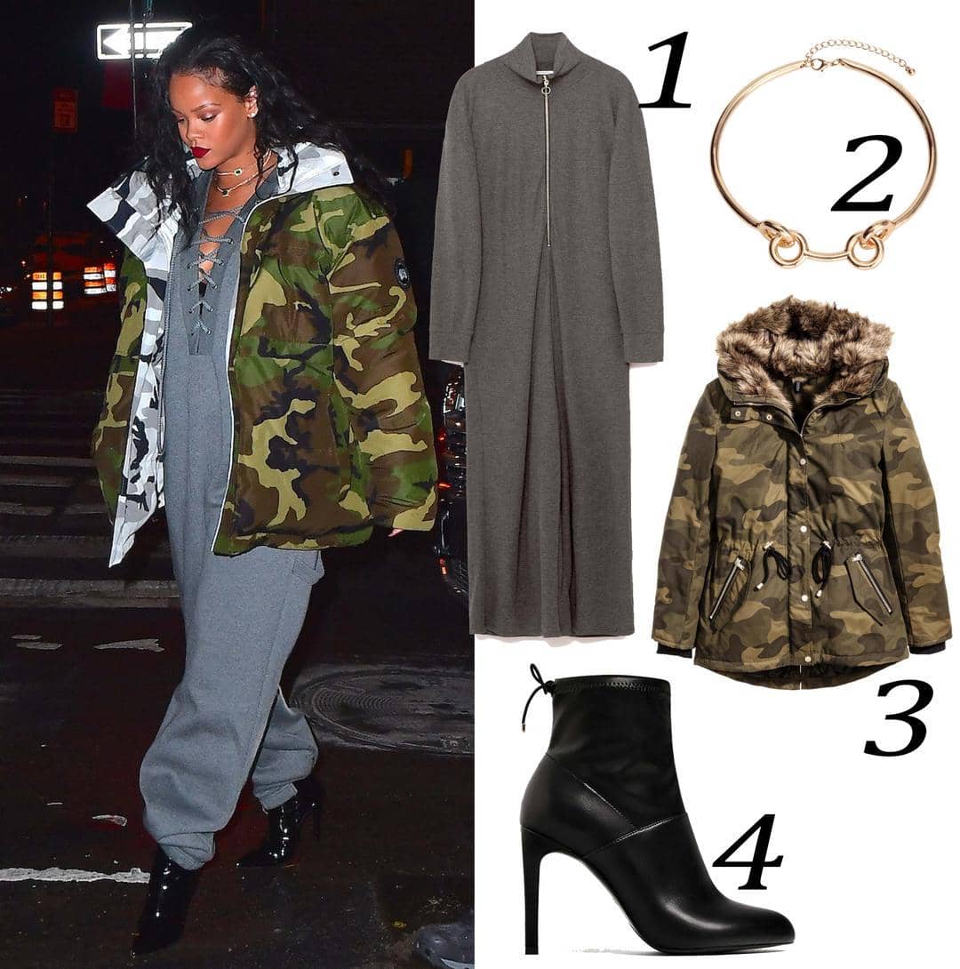 Seksi nggak selalu harus tampil terbuka. Setuju kan?! Kalau biasanya Rihanna selalu tampil 'berani' dengan busananya, kali ini ia tampak seksi dalam versi yang berbeda. Nyaman dalam jumpsuit bersiluet longgar, Rihanna memberikan kesan seksi yang edgy - karena padu-padan jaket camo oversized-nya. Jangan lupa untuk memakai ankle boots juga ya, agar tambah hits!