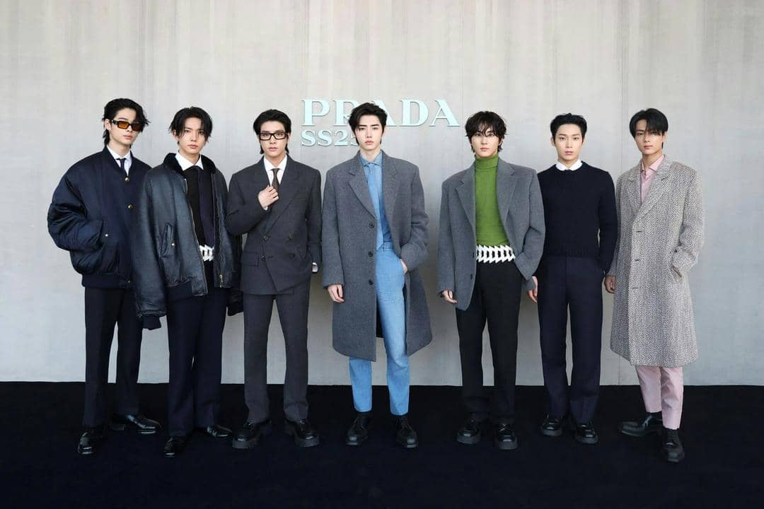 13. Grup idol "ENHYPEN" tampil kompak dengan outfit bergaya officecore hadiri pertunjukan koleksi Prada terbaru.