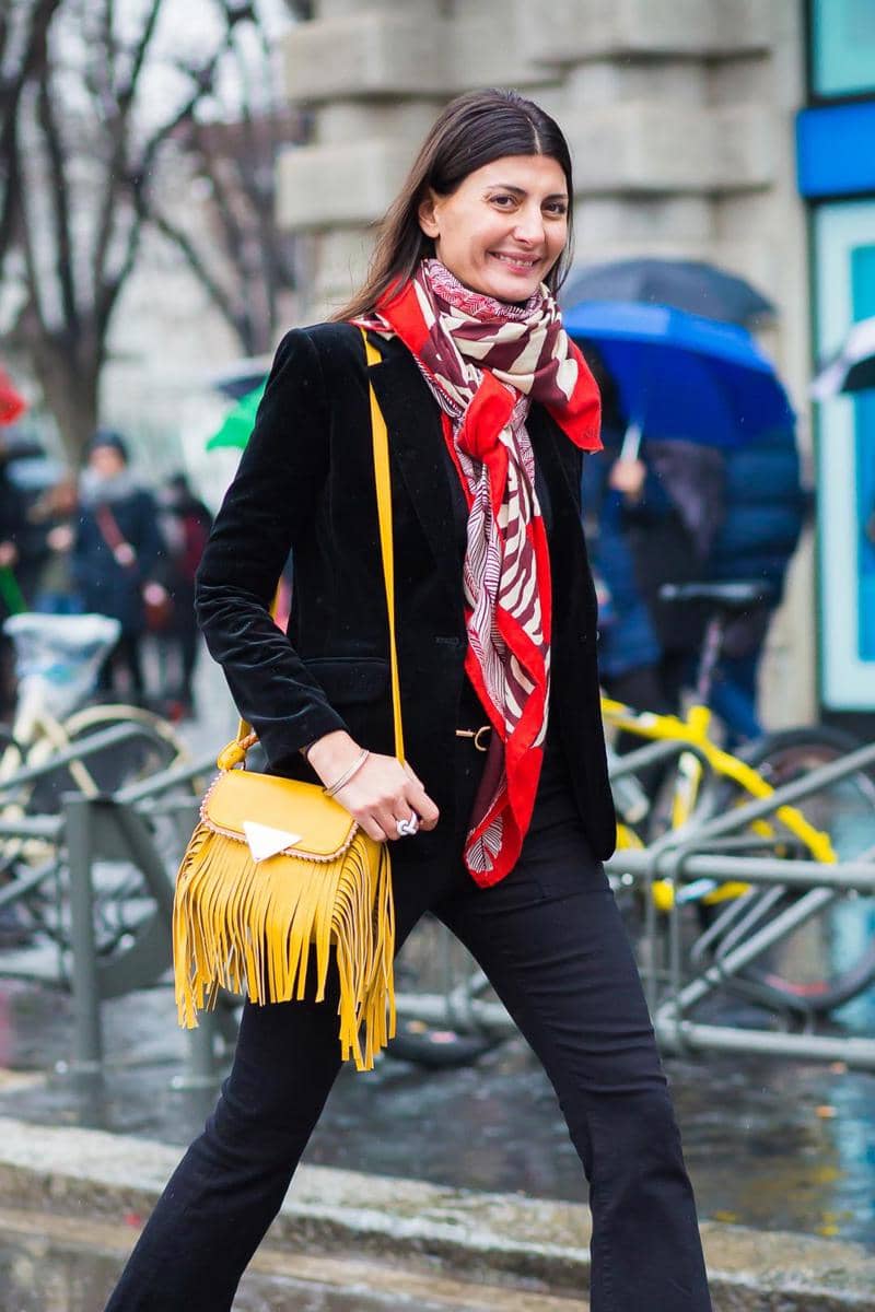 2. Giovanna Battaglia berhasil membuat jaket velvet tetap elegan dalam balutan yang kasual.