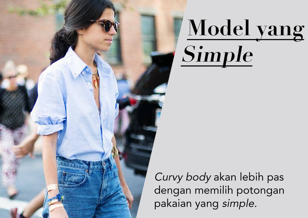 Pemilik tubuh yang cenderung besar atau curvy akan lebih pas jika memilih potongan pakaian yang simple. Kamu juga harus berhati-hati saat ingin menerapakan aksen seperi renda, pleats atau ruffles yang bergelombang dan memberi kesan volume yang justru bisa memberi kesan penuh jika diterapkan pada bagian tubuh tertentu.