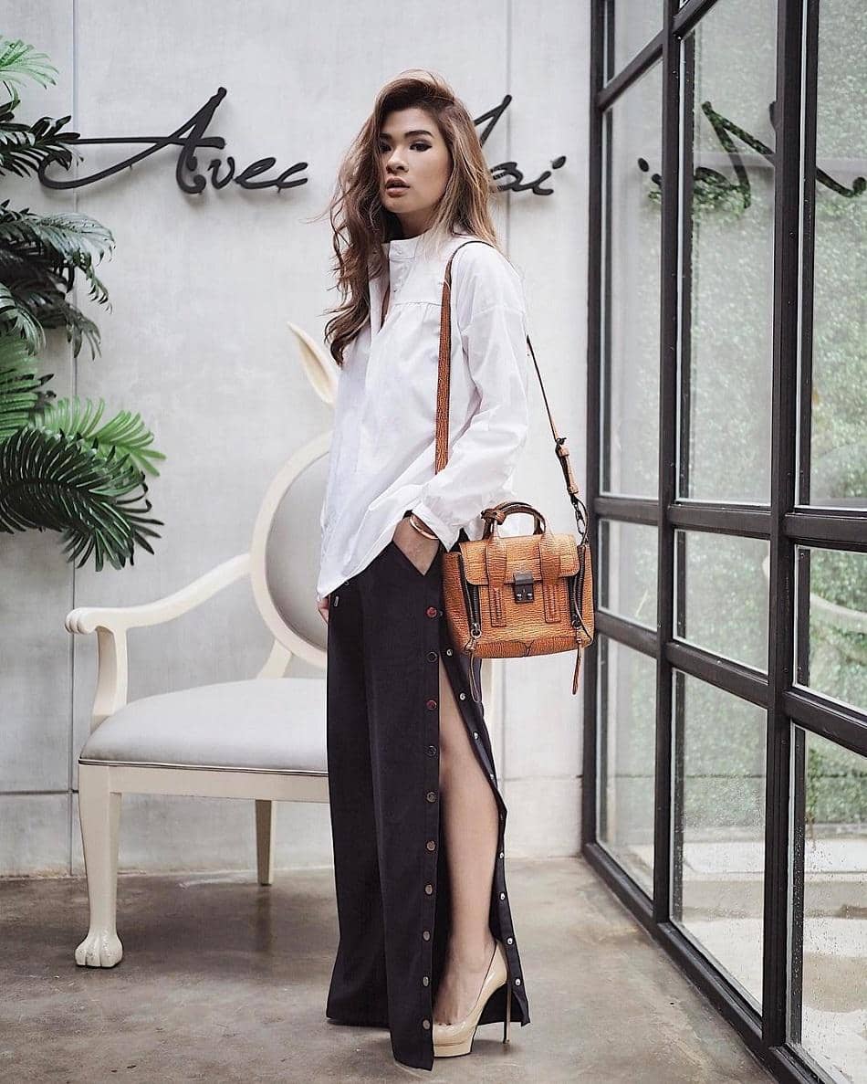 Pasti kalian memiliki celana yang satu ini kan? Hal ini pun juga berlaku untuk Anaz, dirinya memilih untuk memadukan side slit pants with buttons dengan kemeja warna putih. Terkesan lebih rapi saat ia kombinasikan dengan high heels warna pastel.