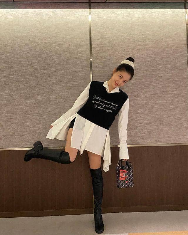 3. Ingin tampil manis a la perempuan Korea, coba pakai scrunchies yang cocok dengan gaya apapun. Bergaya stylish dengan kombinasi oversized shirt, vest, dan boots tinggi.