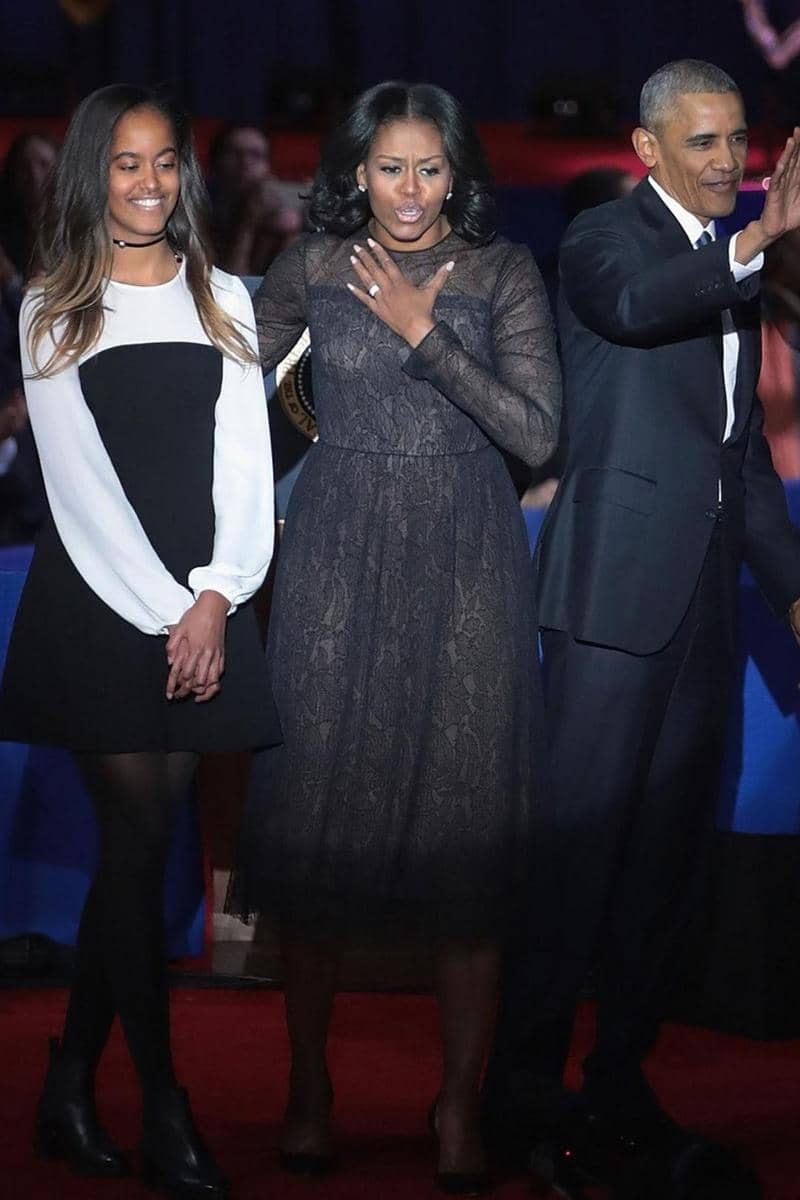 Datang tanpa Sasha Obama pada acara Farewell Barack Obama, Malia tampil sophisticated dengan pilihan color-block dress.