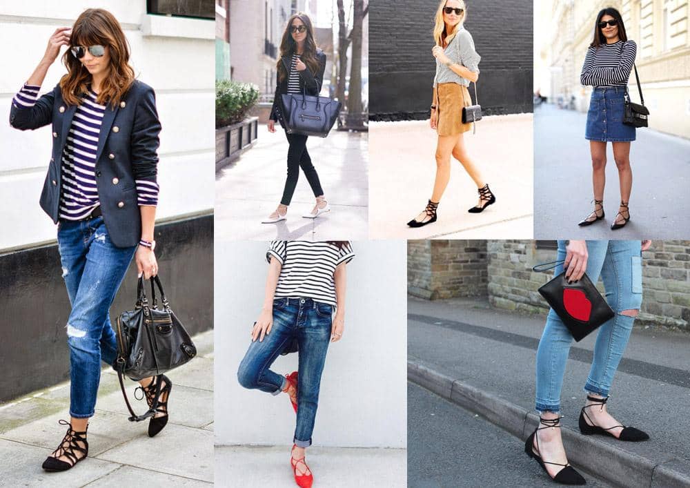 2. Tampil simpel dengan kaos atau kemeja garis-garis dan lace up flats