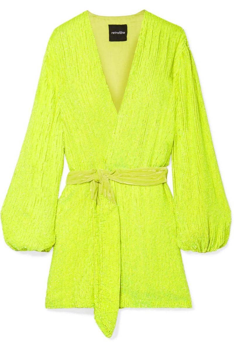 Gabrielle velvet-trimmed sequined chiffon mini wrap dress, Retrofete, $623