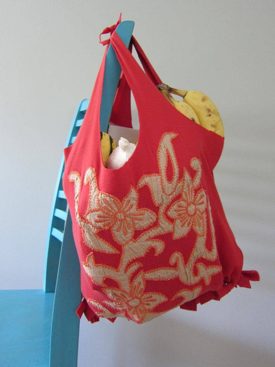 4. Bikin tote bag untuk belanja atau bepergian dari kumpulan T-shirt lama kamu dengan ragam kombinasi warna. Bisa juga kamu tambahkan patch supaya jadi lebih menarik.