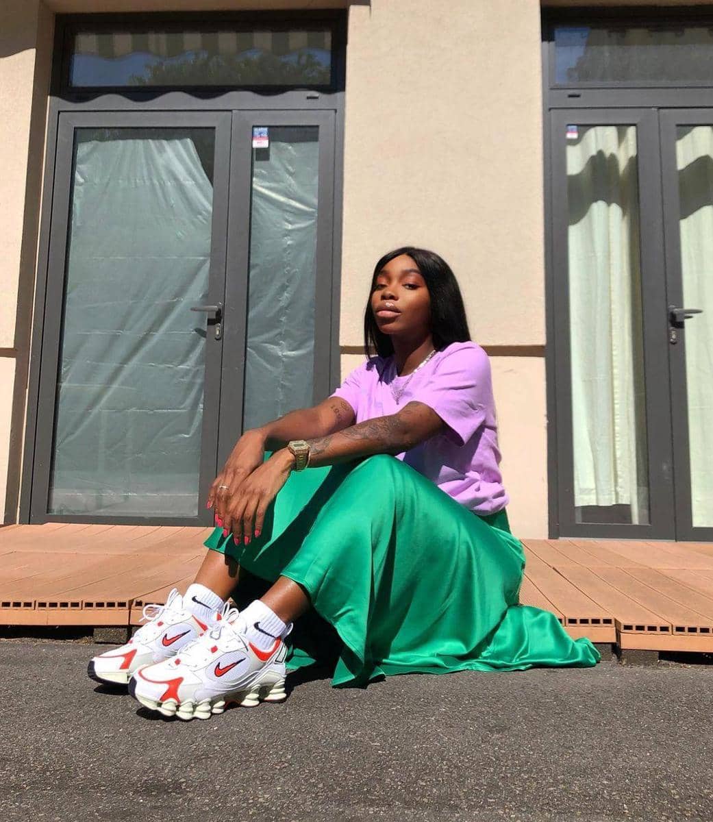 5. Ciptakan OOTD kekinian cukup dengan memasangkan lilac tees dengan rok hijau bahan satin dan sepatu olahraga.
