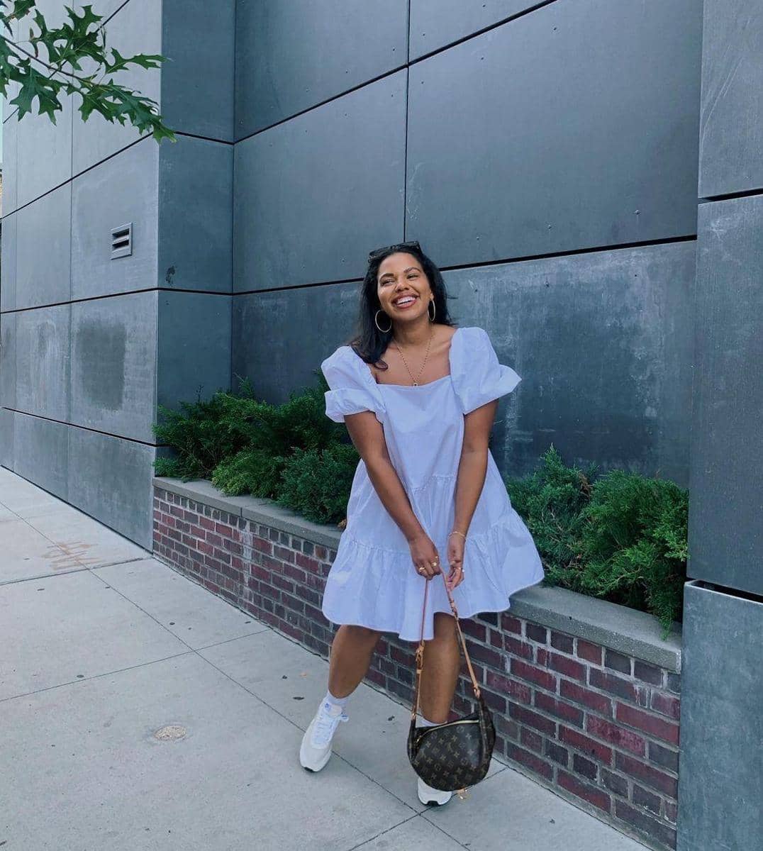 2. Perpaduan antara mini dress dengan sepatu olahraga akan menciptakan gaya manis yang sporty. Jangan ragu untuk sematkan beberapa aksesori sebagai penyempurna penampilan.