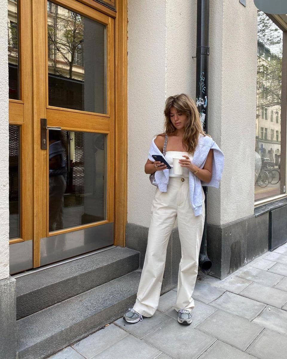 4. Gaya kasual akan berubah 180 derajat jadi makin sporty dengan perpaduan oversized blazer, sport bra, tapered sweats dan sepatu olahraga.