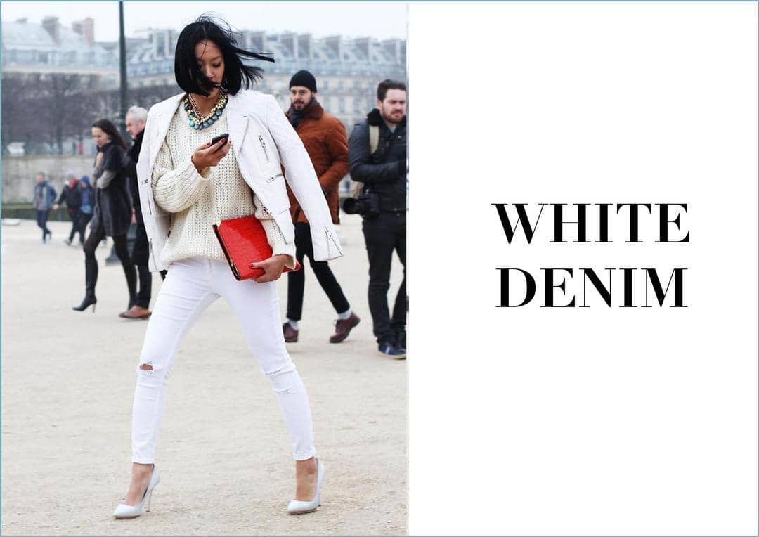 Office denim look tidak akan lengkap tanpa penggunaan celana jeans warna putih. Pilihan yang tepat untuk peampilan yang versatile. Kamu bisa mengeksplorasi gaya dengan menggunakan atasan blus atau kemeja yang cocok dipadukan dengan denim warna putih.
