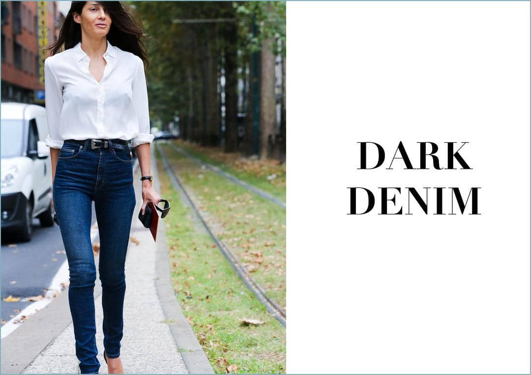 Dark denim is a good excuse for office wear. Warna biru gelap sudah terbukti mampu menciptakan kesan sophisticated pada penampilanmu. Pastikan jika kamu memilih denim piece yang memiliki desain klasik seperti kemeja, rok bahkan overalls.