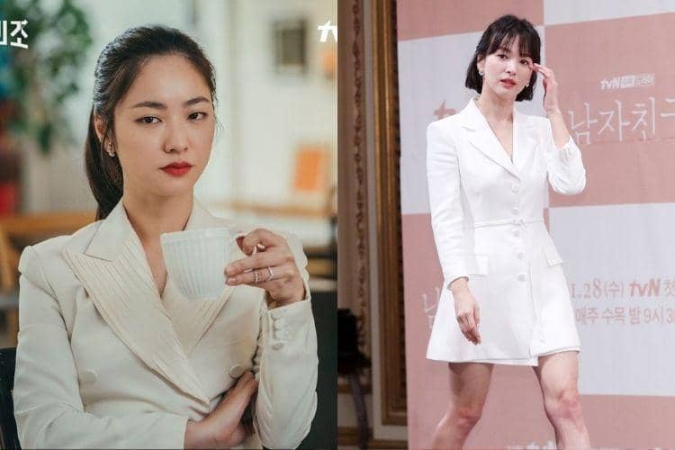 3. Gaya elegan semakin tercipta ketika Jeon Yeo Bin menggunakan blazer putih sebagai atasan sedangkan Song Hye Kyo memakai blazer dress berwarna senada.