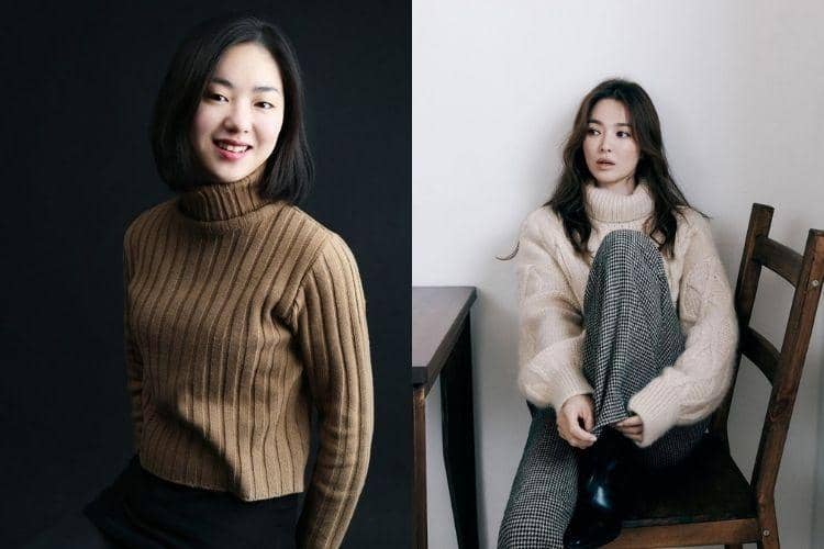 1. Ketika menggunakan turtleneck sweater, Jeon Yeo Bin memasangkannya dengan celana hitam sedangkan Song Hye Kyo dengan celana kotak-kotak dan boots.