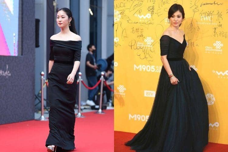 2. Hadir di karpet merah, Jeon Yeo Bin dan Song Hye Kyo kompak menggunakan gaun hitam beraksen off shoulder.