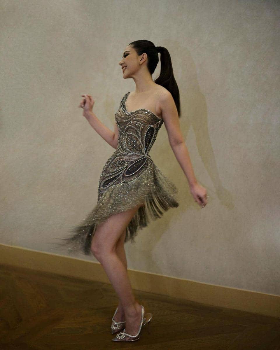 Setelah resepsi selesai, acara dilanjutkan dengan after-party yang dihadiri oleh sahabat kedua mempelai. Tak lagi mengenakan gaun panjang, Jessica Mila memilih tampilan yang lebih playful dengan dress bernuansa emerald dari Hian Tjen. Strapless dress dengan siluet asimetris ini bertabur payet yang berkilauan.