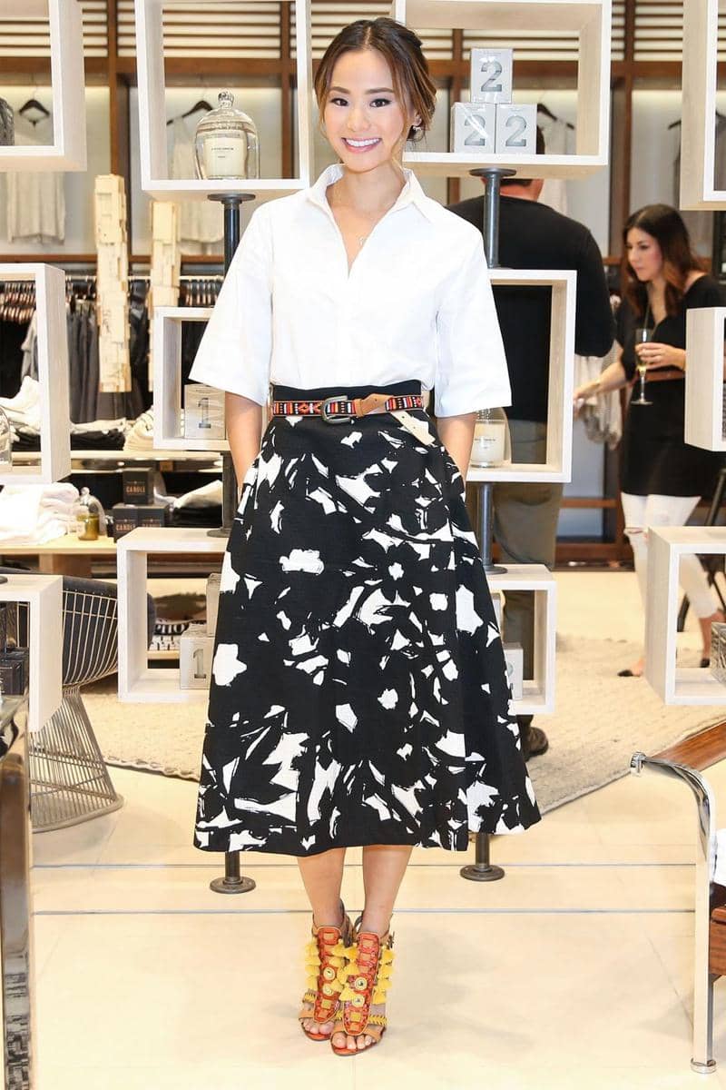 1. Tampilkan sisi manis dengan memadukan a-line skirt dan atasan basic.