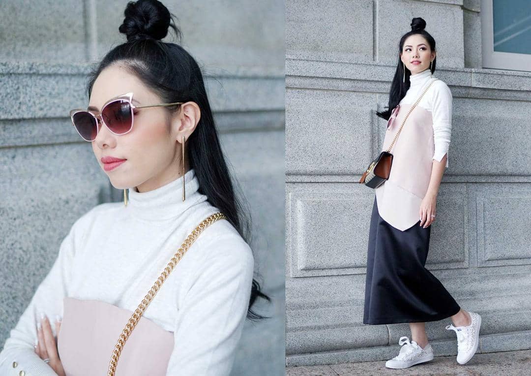 Untuk outfit of the day, aku mengkombinasikan sweater dari ZARA dan blocked coloured dress dari Stellarissa. Menurutku, ini adalah cara yang sempuran untuk memakai summer tube dress di musim gugur. Untuk mengangkat outfit, aku mempadu padankannya dengan edgy sneakers dari Lost & Found – yang sempurna untuk hari-hari dimana aku ingin terlihat nggak terlalu kasual namun comfy.
