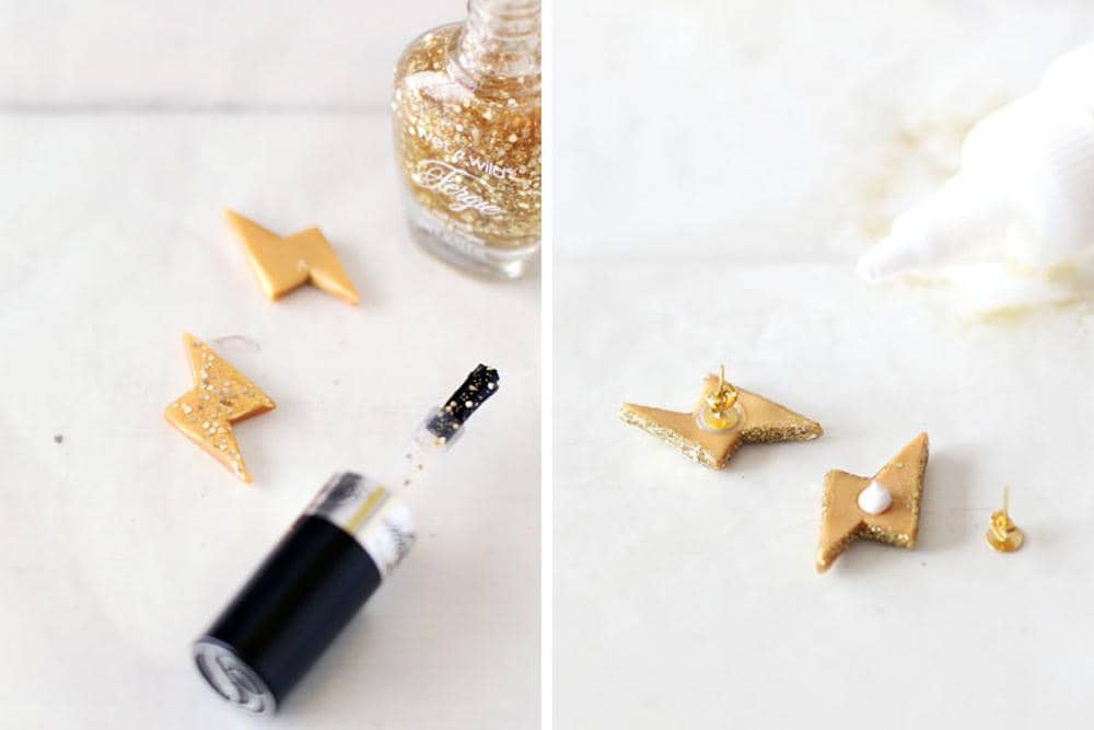 Selanjutnya pilih dua thunderbolts yang sudah kamu cetak, siapkan baking pan lalu letakan clay dan panaskan dengan suhu 275 celcius dalam waktu 30 menit. Kemudian setelah kering, kamu bisa memulai memberikan lem dan mengoleskan kutek glitter diatasnya, lalu tunggu hingga mengering agar bisa ditempelkan earring back.
