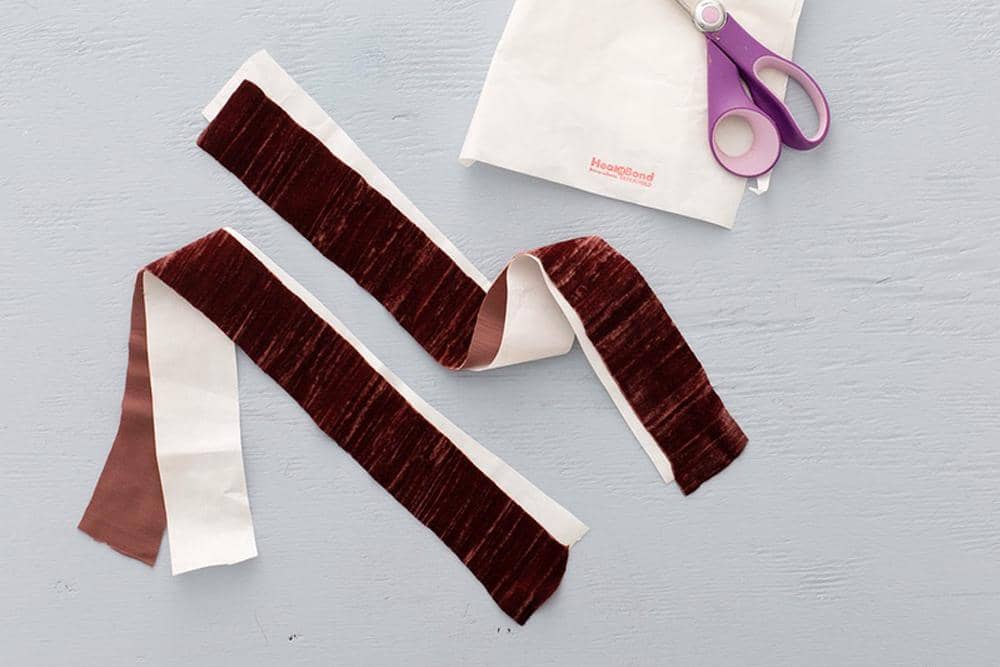 1. Setelah bahan-bahan siap, kemudian gunting kain velvet menjadi 2 dengan ukuran masing-masing 4 cm. Lalu sesuaikan panjangnya dengan heat n bond kamu.