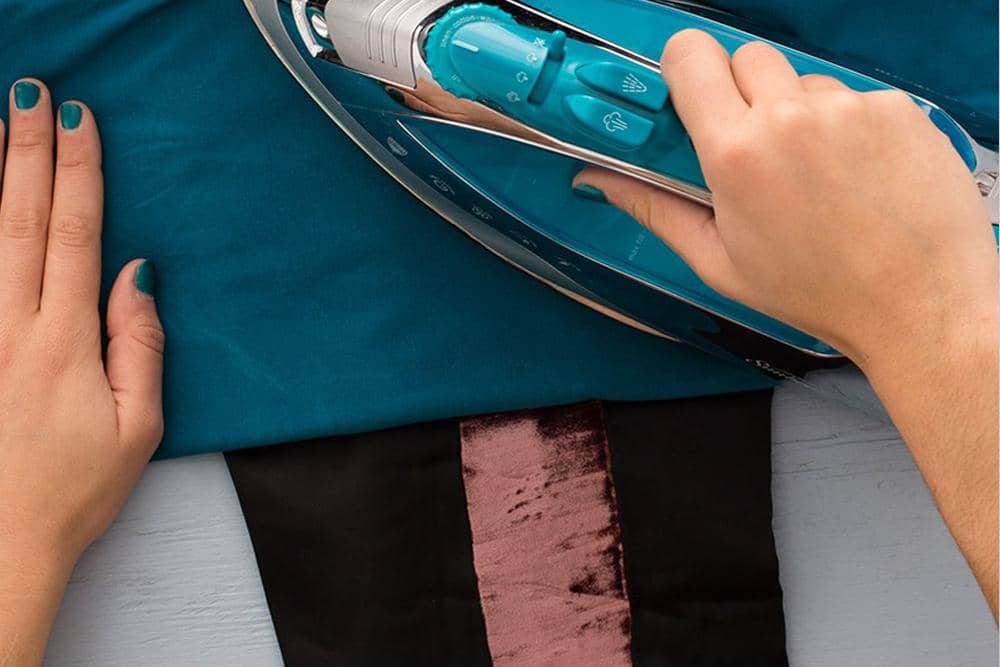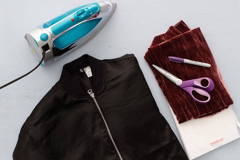 3. Berikutnya letakan velvet kamu di kiri kanan bomber jaket. Sebelum kamu mulai untuk menyetrikanya berikan alas berbahan katun. Tujuannya agar tidak merusak velvet dan bahan bomber jaket.