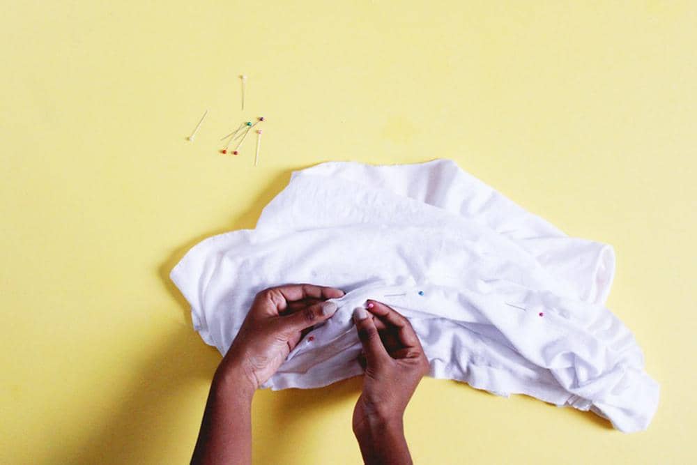 3. Setelah selesai kamu bisa mulai menusukkan jarum pentul ke bagian dalam potongan yang akan menjadi ruffle di peplum buatanmu.