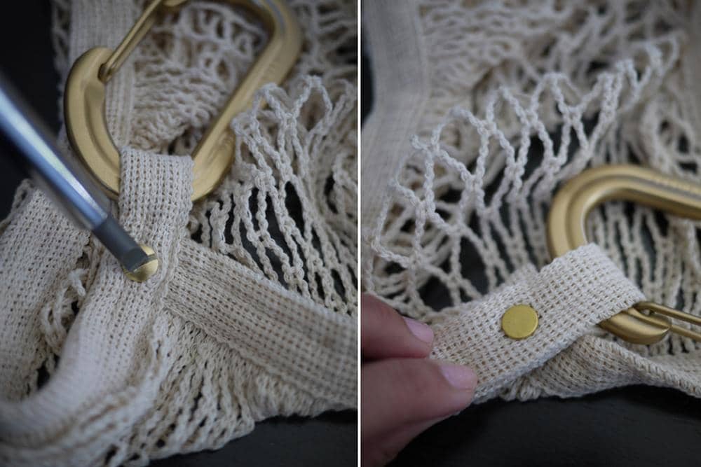 Setelah itu, lobang yang kamu sudah bentuk tadi , mulai kamu bolongi dengan gunting , lalu masukan sekrup dan kencangkan dengan obeng. Lakukan ini ke seluruh lubang yang sudah kamu buat. Kemudian kaitkan karabiner yang akan berfungsi sebagai handle bag ini