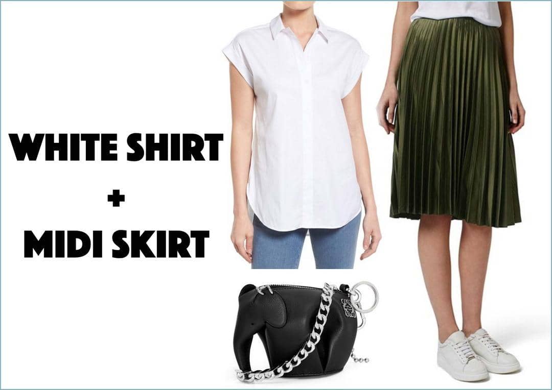 Kemeja warna putih akan mengurangi rasa panas pada tubuh kamu saat siang hari. Padukan bersama rok midi yang memberi kesan chic pada gaya kasualmu. Lengkapi outfit dengan elephant signature bag dari Loewe.
